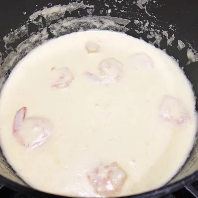 モッツァレラチーズと加えてゆっくり混ぜ、混ざったら、生のエビを加えてさらに5分煮る。味を見て必要ならば、塩で調整する。