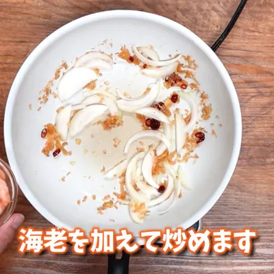 玉ねぎ、むきエビを炒めます