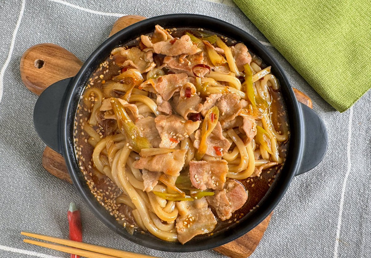 冷凍うどんを入れてほぐし、仕上げにラー油・厚辛子・白ごまをかけて完成