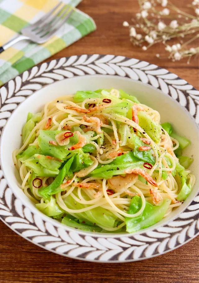 みずみずしくて甘い春キャベツがたっぷり♡ 白だしでちょっと和風に仕上げた ペペロンチーノです。 桜エビがポイント! 香ばしさと旨みがプラスされ、 美味しさがアップしますよ。