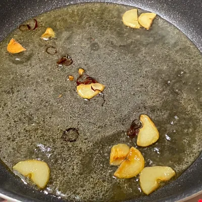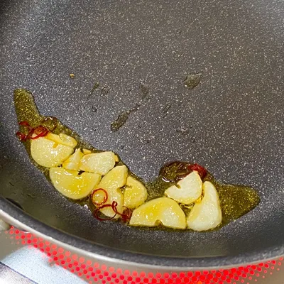 フライパンににんにく、赤唐辛子、オリーブオイルを弱火で加熱する。