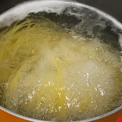 湯を沸かし、塩(湯の1%)を入れ、スパゲッティを袋の表示時間より1分短くゆでる。