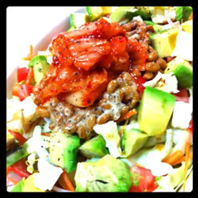 5秒触らずに待ったら、菜箸でフライパンのふちから中心の方へ大きくグルグル混ぜます。スクランブルエッグを作るように!